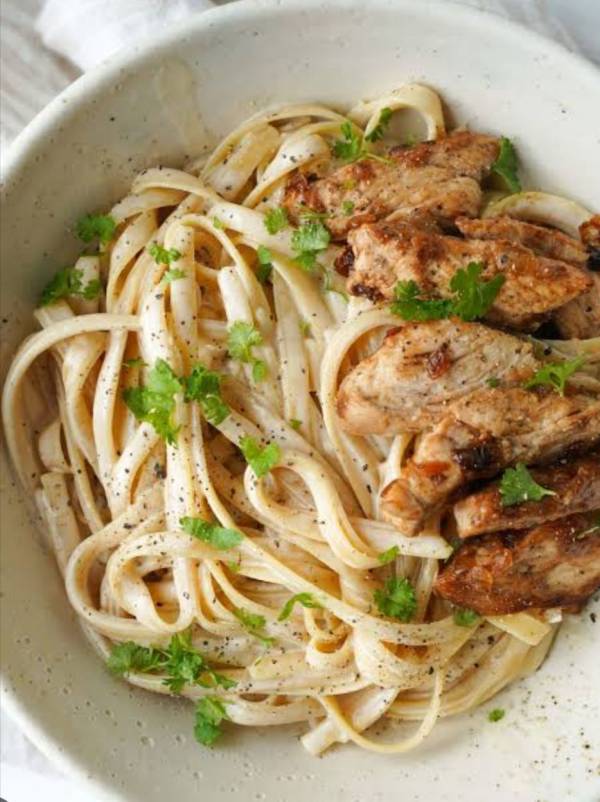 فيتوتشيني، مشروم، صلصة كريمة، مغطاة بجبنة بارميزان ودجاج